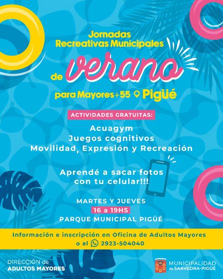 Martes y jueves, desde las 16.00 hasta las 19.00 horas, se harán actividades gratuitas de Acuagym, juegos cognitivos, movilidad, expresión y recreación, sumando a esto un curso para sacar fotos a través del teléfono celular.