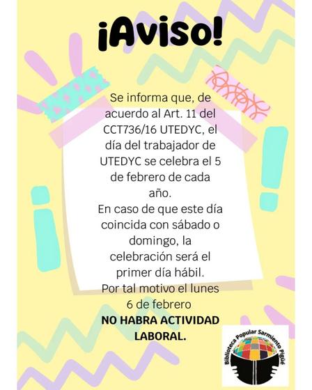 Este lunes, 6 de febrero, la Biblioteca Popular Sarmiento permanecerá cerrada por celebrarse el Día del Trabajador de UTEDYC.