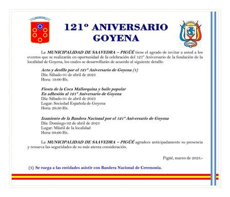 Mañana, sábado, a las 19.00 horas, se hará el acto y el desfile por el 121º Aniversario de la fundación de la localidad de Goyena, mientras que, luego a las 20.30 horas, en la Sociedad Española tendrá lugar la Fiesta de la Coca Mallorquina.