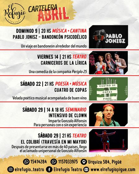 Para el domingo 9 de abril estará presentándose Pablo Jonisz, el viernes 14 se hará la puesta en escena de 'Carniceros de la Lírica', el sábado 22 habrá poesía y música con 'Cuatro de Copas', y el sábado 29 se llevará a cabo un Seminario Intensivo de Clown.