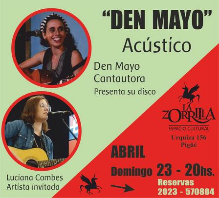 El domingo 23 de abril, a las 20.00 horas, Den Mayo, que es cantautora, y presentará su disco 'El lado lleno'.