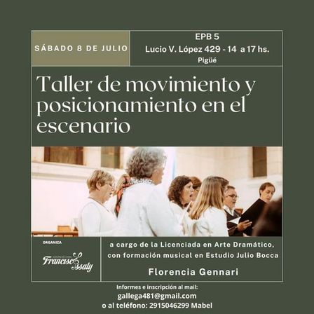 La Agrupación Coral Francisco Issaly está organizando un taller que dictará la Lic. en Arte Dramático Florencia Gennari, sobre el movimiento y posicionamiento en el escenario, orientado a cantantes de coro y cantantes solistas, como así también para integrantes de bandas y conjuntos musicales.