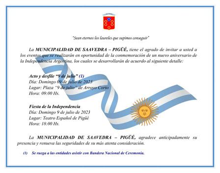 El día domingo, desde las 9.00 horas, el acto protocolar, con su desfile, se llevará a cabo en la Plaza 9 de Julio de Arroyo Corto.
