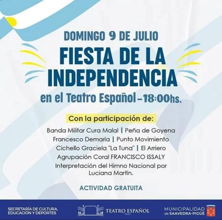 Este domingo, con entrada gratuita, a las 18.00 horas, en el Teatro Español de Pigüé, se presentarán la Banda Militar Cura Malal, la Peña de Goyena, Francesco Demaría, Punto Movimiento, Graciela ‘La Tuna’ Cichello, El Arriero y la Agrupación Coral Francisco Issaly