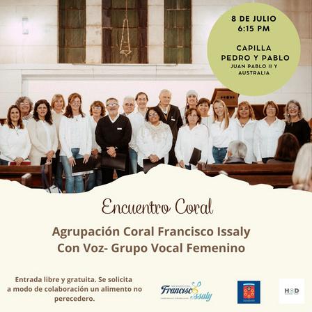 Por la presentación anunciada para las 18.15 horas en la Capilla San Pedro y San Pablo la Directora de la Agrupación Coral Francisco Issaly sostuvo “se pide a modo de colaboración, el que pueda, un alimento no perecedero para un merendero que tiene la Iglesia”.