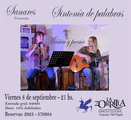 El viernes 8 de septiembre, a las 21.00 horas, el Dúo Sanares, con Adriana Bonillo y Alejandra Varela, presentará el show 'Sintonía de palabras' con música y poesía.