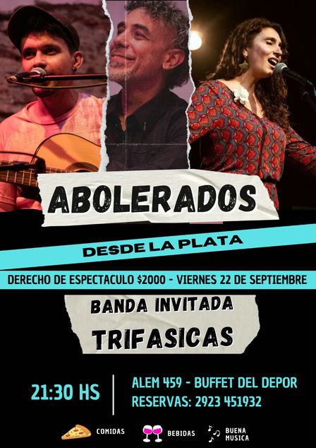 El Buffet del Depor prepara la puesta en escena de la banda platense Abolerados, con Julieta Cabrera en voz, Leonardo Gianibelli en percusión y Hernán Ruíz Díaz en guitarra, con repertorio de boleros, tangos, música afro peruana, candombes y otros ritmos.