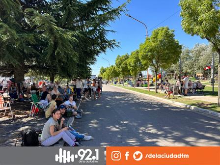 En la tarde de hoy, previo a la presencia de los representantes de las distintas instituciones de la localidad, en la avenida principal de la localidad el público se ubica bajo los árboles.