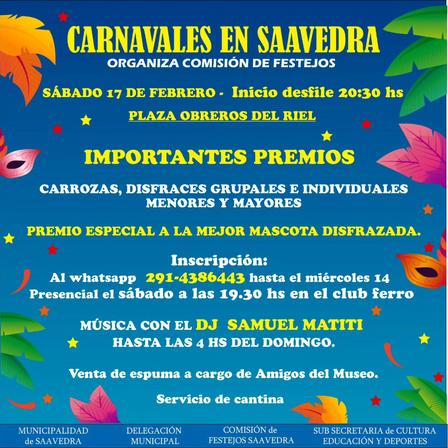 La Comisión de Festejos prevé las celebraciones de carnaval, desde las 20.30 horas, en la Plaza Obreros del Riel de Saavedra.