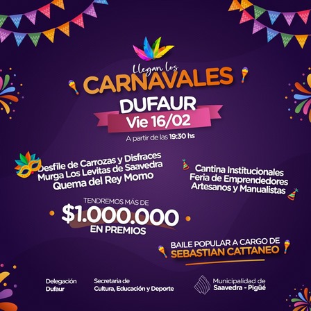 En Dufaur contarán con la presentación de la Murga Los Levitas de Saavedra, la tradicional Quema del Rey Momo, y un baile popular a cargo de Sebastián Cattáneo.
