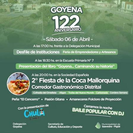 Desde las 17:00 horas del sábado 6 de abril, frente a la Delegación, la Escuela Primaria N° 7 y la Sociedad Española, habrá un corredor gastronómico distrital, presentarán el libro "Goyena... Caminando su historia", y habrá espectáculos artísticos y musicales.