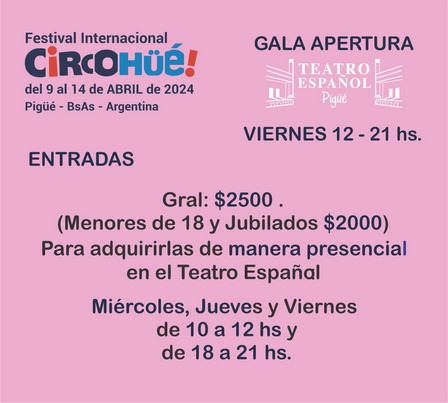 En la Boletería del Teatro Español, ubicada en calle España 120 de Pigüé, las generales cuestan 2.500 pesos, mientras que, para menores de 18 años, y para jubilados saldrán 2.000 pesos.