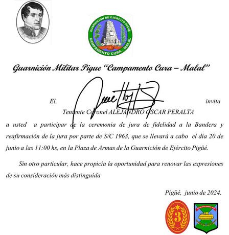 Esta ceremonia se llevará a cabo en la Plaza de Armas de la Guarnición Militar Pigüé.
