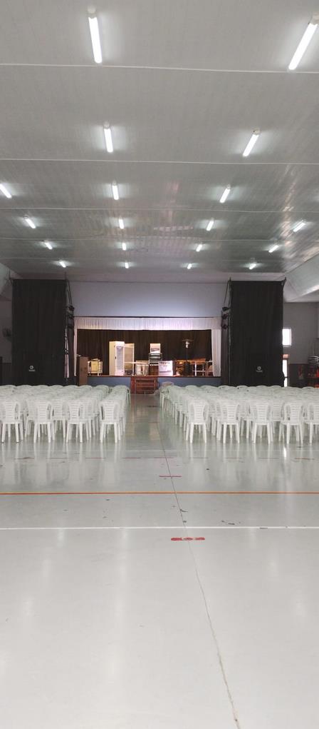 En el Salón de Usos Múltiples de la Escuela de Espartillar fueron distribuidas las sillas y sobre el escenario ya se encuentran instaladas heladas, calentadores, hornos, y cocinas.