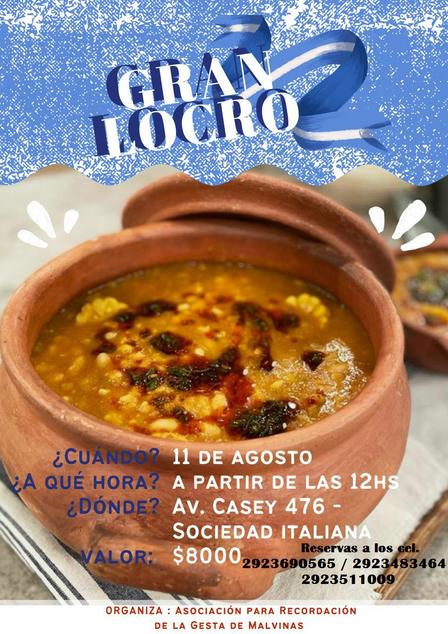 Por la venta de locro las porciones ya se ofrecen, a 8.000 pesos, a cargo de la Asociación para la Recordación de la Gesta de Malvinas, a través del 2923 69 05 65, al 2923 48 34 64 y al 2923 51 10 09.