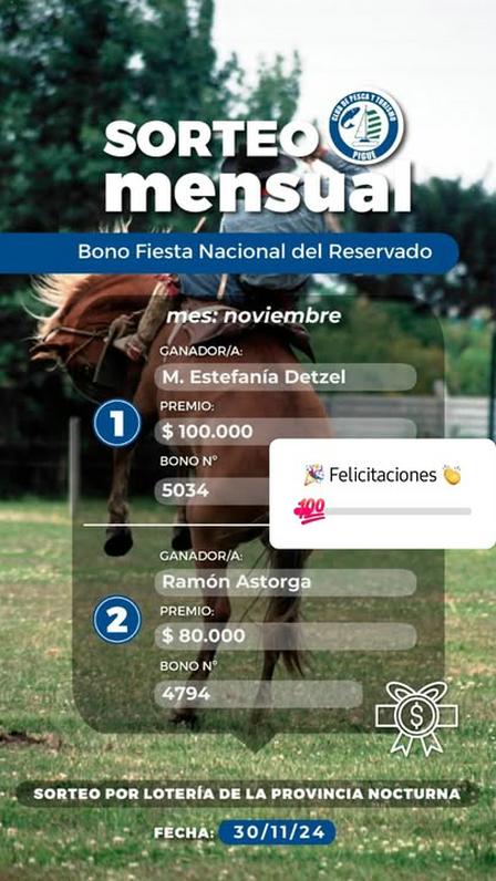 Se trata de los sorteos mensuales del bono contribución de la Fiesta Nacional del Reservado que organiza el Club de Pesca y Turismo de Pigüé.