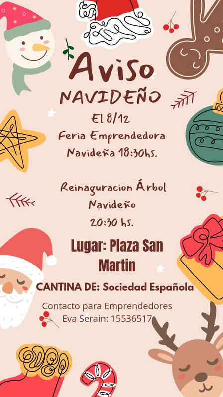 Este domingo, 8 de diciembre de 2024, en la Plaza San Martín se prevé desarrollar, desde las 18.30 horas, una feria de emprendedores, y luego, a las 20.30 horas, la reinauguración del Árbol Navideño.