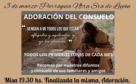 Esta tarde, hoy, lunes 3 de marzo de 2025, tras la misa se hará la Adoración del Consuelo, en el Templo Nuestra Señora de Luján de Pigüé.