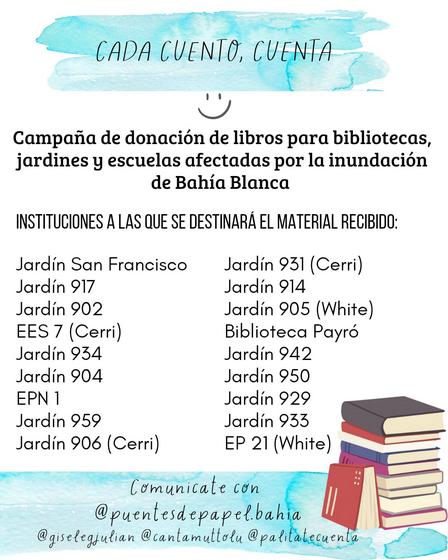 En la Biblioteca Popular Sarmiento, ubicada en Avenida Mitre 170 de la ciudad, estarán recibiendo libros para bibliotecas, jardines de infantes, y escuelas afectadas por la inundación en la zona de Bahía Blanca.