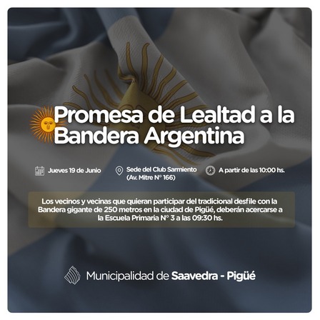 Antes, a las 9.30 horas, invitan a todos los ciudadanos que quieran participar del tradicional desfile con la bandera gigante de 250 metros, saliendo desde la Escuela Primaria Nº 3, en Avenida Alsina 76, a partir de las 09:30 horas.