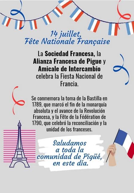 El mensaje expresa "la Sociedad Francesa, la Alianza Francesa de Pigüé, y Amicale de Intercambio, celebran la Fiesta Nacional de Francia.