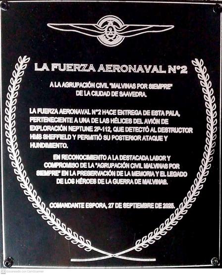 La Fuerza Aeronaval Número 2 hizo entrega de la pala perteneciente a una de las hélices del avión de exploración Neptune 2P - 112, que detectó al destructor HMS Sheffield, y permitió su posterior ataque y hundimiento.