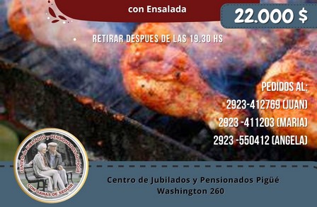 En FM de la Ciudad el Presidente del Centro de Jubilados y Pensionados de Pigüé indicó “por 22.000 pesos hay pollo a la parrilla con ensaladas”.