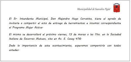 El viernes, por la mañana, a las 11.00 horas, en la Sociedad Italiana de Socorros Mutuos tendrá lugar la entrega de herramientas e insumos del Programa Mujer Activa.