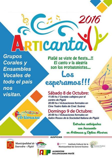 El sábado 8 de octubre, desde las 11.00 horas, se llevará a cabo una cantata callejera por el centro de la localidad de Pigüé, mientras que, a las 20.00 horas tendrá lugar la presentación de los coros en el Cine Teatro Italia de Coronel Suárez.