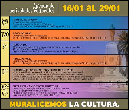 La agenda cultural incluye la presentación 'A boca de jarro', con 'Cuerpo, voz, y canción', el Programa de Excursión disfrutando lo nuestro, y 'Pigüé en Sol'.