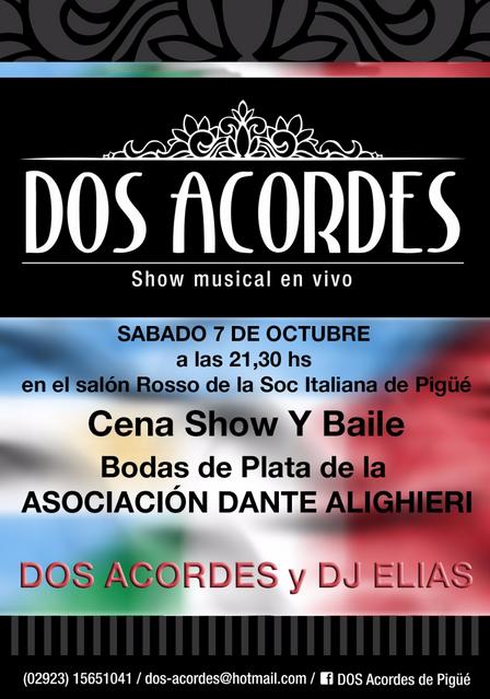 El sábado 7 de octubre, en la Sociedad Italiana, se llevará a cabo la cena show y baile con Dos Acordes y DJ Elías.