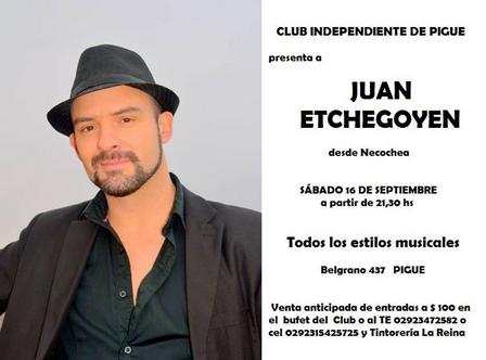El sábado 16 de septiembre, a las 21.30 horas, se presentará Juan Etchegoyen en el Club Independiente.