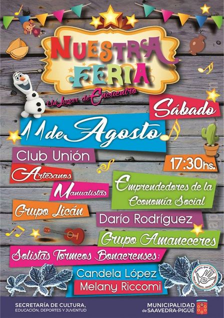 La propuesta de Nuestra Feria, organizada por la Secretaría de Cultura Municipal, será con entrada gratuita luego de las 17.30 horas en el Gimnasio Centenario del Club Unión Pigüé.