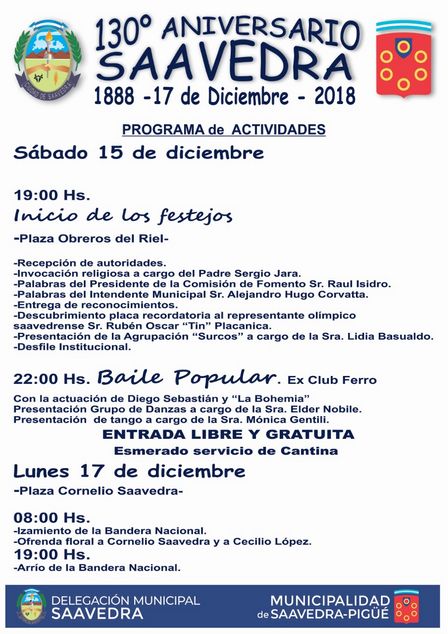 Este sábado se harán los festejos por el 130º Aniversario de Saavedra