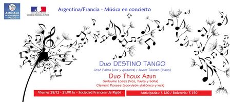 El viernes de la semana próxima se presentarán el Dúo Thoux Azun y el Dúo Destino Tango bajo la organización conjunta de la Sociedad Francesa y Amicale de Intercambio.
