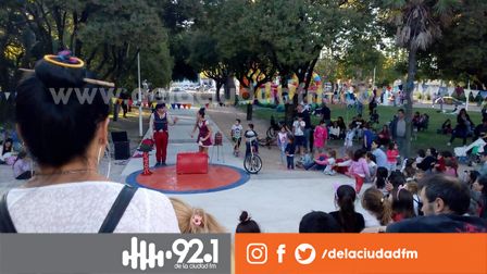Capturando la atención de grandes y pequeños los artistas se presentaron en la Pérgola de la Plaza Sarmiento con un show a la gorra.