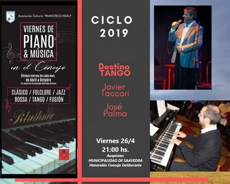 Para el viernes 26 de abril está prevista la presentación del Dúo Destino Tango, en el Salón del Honorable Concejo Deliberante, desde las 21.00 horas.