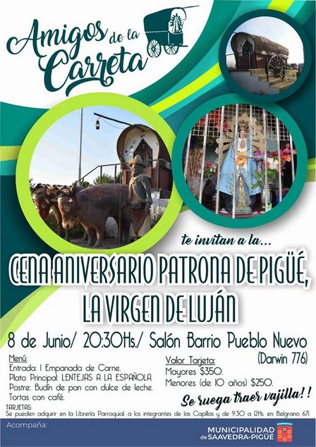 El 8 de junio, a las 20.30 horas, en el Salón Barrio Pueblo Nuevo, tendrá lugar la cena aniversario de la Patrona de la ciudad de Pigüé.