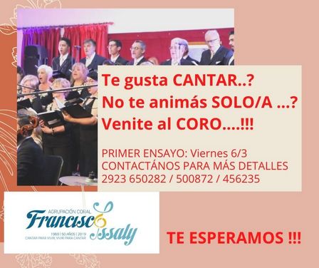 La nueva Directora de la Agrupación Coral Francisco Issaly destacó “estoy con muchas ganas de comenzar a trabajar este año con el Coro Francisco Issaly. Retomará el coro la actividad el viernes 6 de marzo”.