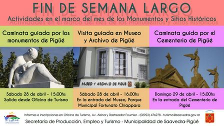 El sábado, a las 15.00 horas, tendrá lugar la presentación de una caminata guiada por los monumentos de la ciudad, mientras que, luego, a las 16.00 horas, se llevará a cabo una visita guiada al Museo y Archivo de Pigüé.