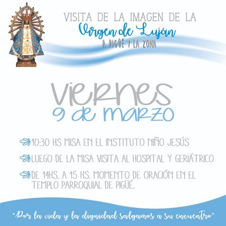 El viernes, a las 10.30 horas, tendrá lugar la visita de la imagen de la Virgen de Luján al Instituto Niño Jesús donde se hará una misa.