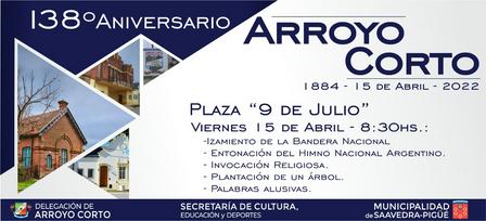 Los 138 años de Arroyo Corto contarán con el izamiento del pabellón nacional, la entonación del Himno Nacional Argentino, una invocación religiosa, la plantación de un árbol, y palabras alusivas de autoridades.
