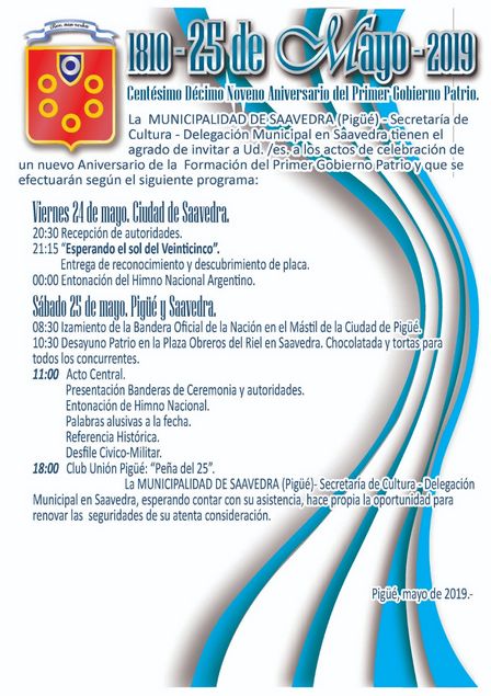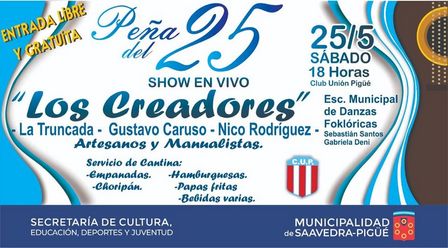 La Secretaria de Cultura Municipal señaló “a las 18.00 horas, el sábado, en el Club Unión de Pigüé vamos a disfrutar de la Peña del 25 que tanto éxito tuvo el año pasado”.