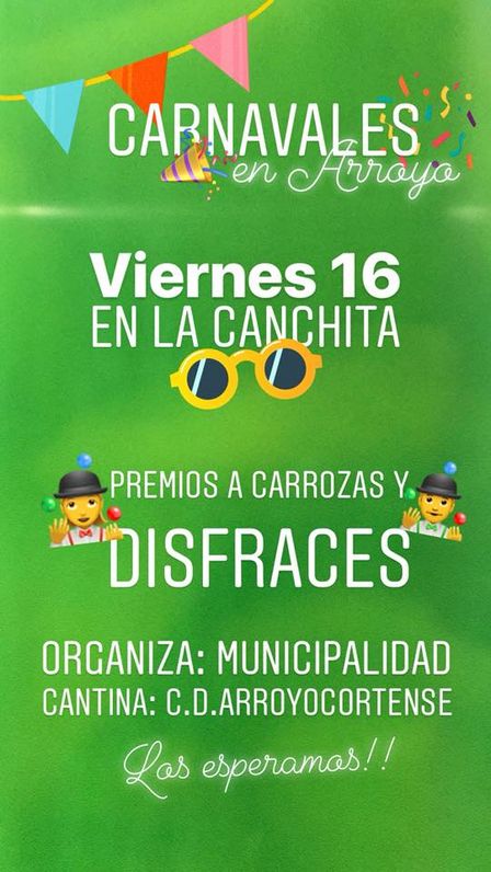 El viernes 16 de febrero, por la noche, en el predio de la canchita del Club Deportivo Arroyocortense, se harán los corsos.
