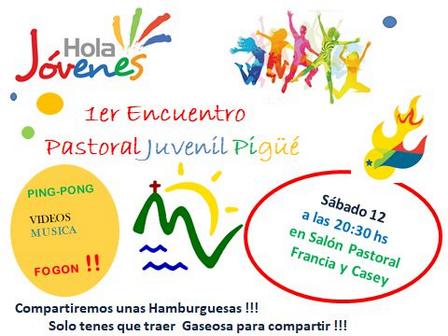 Este sábado, a las 20.30 horas, tendrá lugar el Primer Encuentro Pastoral Juvenil en calle Francia esquina Avenida Casey.