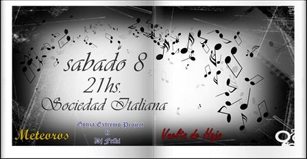 En el salón de la Sociedad Italiana de Pigüé se presentarán Vuelta de Hoja, Meteoros, y Gonza Extremo Project.