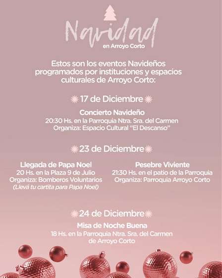 Para el día 23 de diciembre se prevé la llegada de Papá Noel a la Plaza 9 de Julio, a las 20.00 horas, contando con la organización a cargo de los Bomberos Voluntarios de la localidad, mientras que, más tarde, a las 21.30 horas, se hará el Pesebre Viviente en el patio del Templo Parroquial.