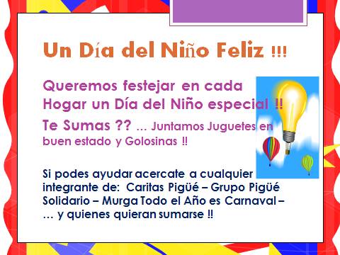 El Día del Niño motivó una campaña solidaria de CARITAS, el Grupo Pigüé Solidario, la Murga Todo el Año es Carnaval, y un grupo de colaboradores para recolectar golosinas y juguetes.