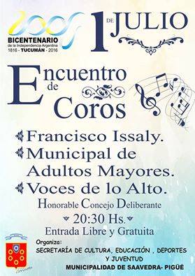 El viernes próximo, a las 20.30 horas, en el Salón del Honorable Concejo Deliberante se presentarán el Coro Municipal de Adultos Mayores, el Coro Voces de lo Alto, y el Coro Francisco Issaly.