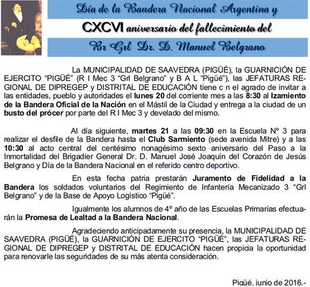 El martes, a las 9.30 horas, se llevará a cabo el desfile de la Bandera hasta el Club Sarmiento, partiendo desde la Escuela Número 3, y luego tendrá lugar la Jura de Fidelidad.